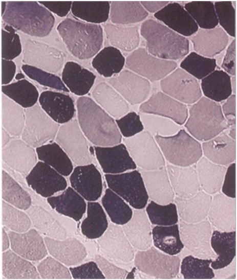 Przekrój biopsyjny przez mięsień człowieka. Ciemniejszym kolorem oznaczone są włókna I, jaśniejszym włókna II